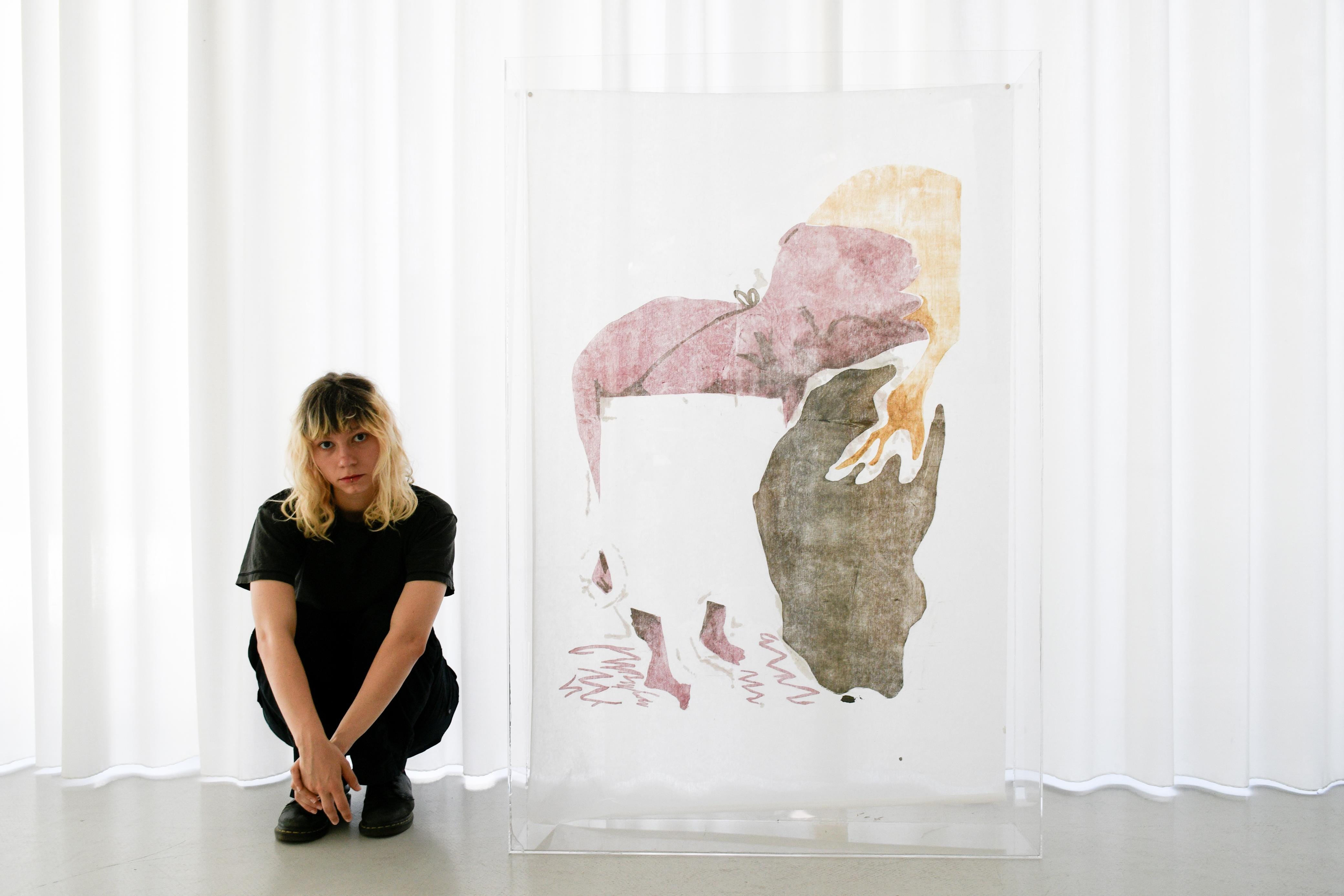 Lola Pfeifer next to her work: Nach dem Dusch bemerkt, dass ich mein Handtuch vergaß, 2024. Images courtesy of the artist.